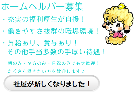 | 仕 事 | ホームヘルパー※直行直帰 主に駿河区・葵区(安倍川以東の訪問先も有り)のご利用者様宅へ訪問し、身体介護や生活援助をお願いします。 |